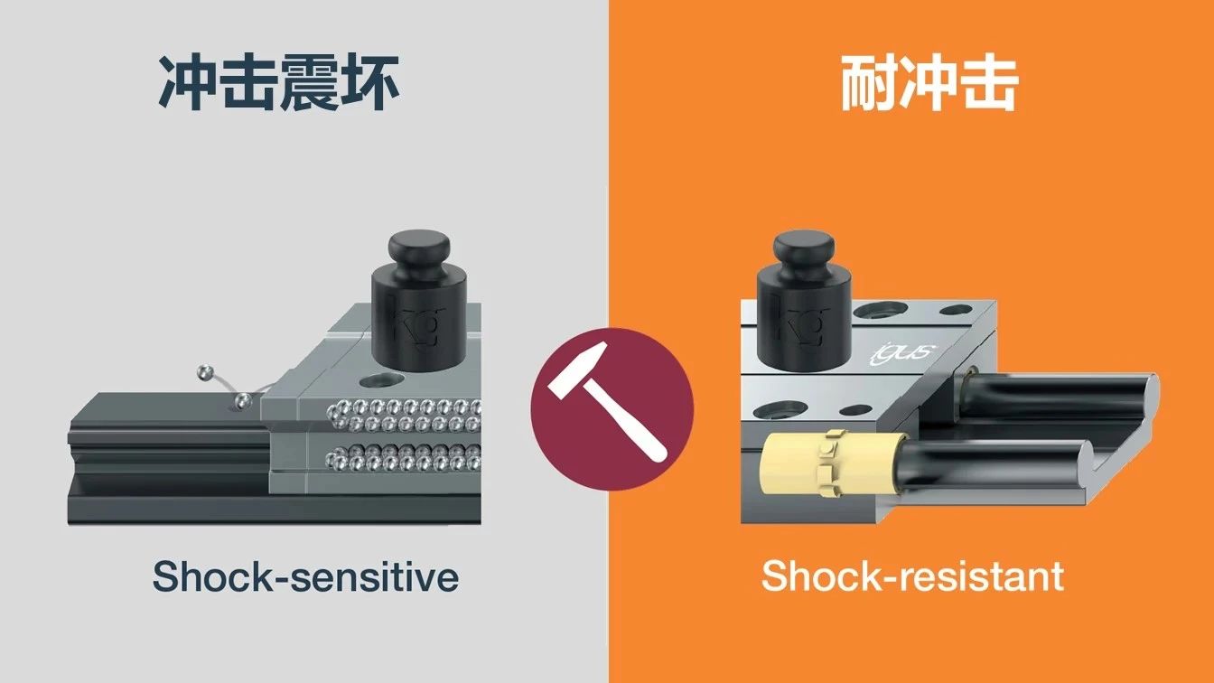 循环滚珠轴承中的细小部件使系统对冲击非常敏感,在短道快速换向移动的情况下尤为明显,与轴装配时也需对准中心缓慢进行,否则会导致钢珠脱落或者保持器变形。相比之下,drylin直线滑动轴承结构简单得多。