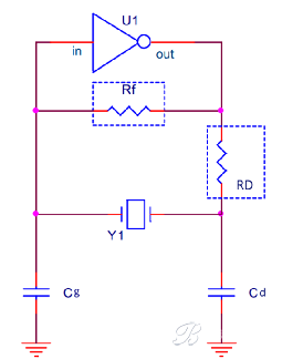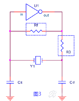 这个电阻的作用是限制IC的驱动能力,并且与Cd组成一个低通滤波器,以确保振荡器的起振点在基频上,而不是在其他高次谐波频率点上(避免3次,5次,7次谐波频率)。如果晶振的功耗超过晶振制造商的给定值,外部电阻Rd是必需的,用以避免晶振被过分驱动。如果晶振的功耗小于晶振制造商的给定值,就不推荐使用Rd,可以预设0Ω。如图3所示