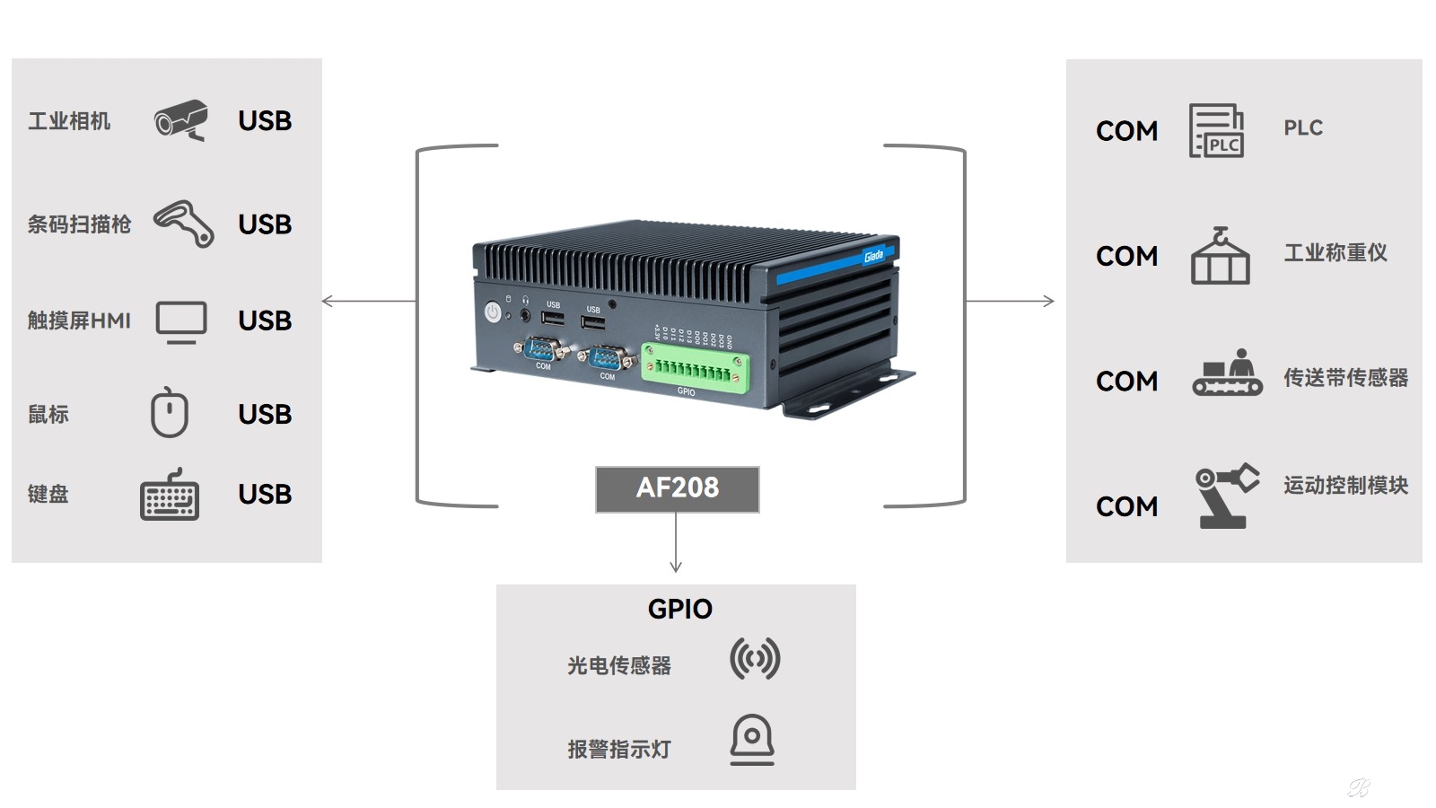 接口配置可应对设备连接,符合成本与性能的平衡需求。同时,AF208 的无风扇设计能更好地适应车间粉尘环境,且其尺寸更小巧,安装在控制柜内更节省空间。