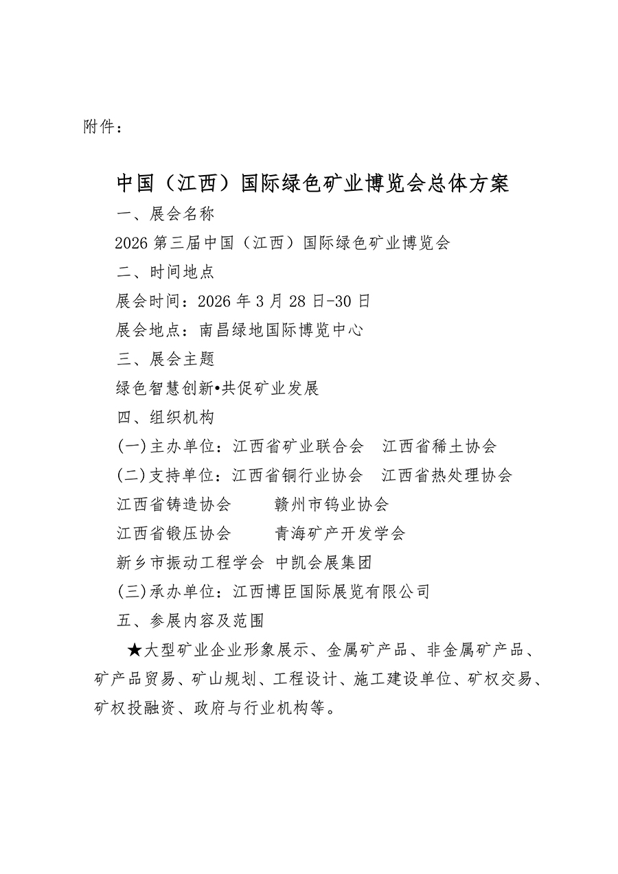 本届展会由江西省矿业联合会、江西省稀土协会主办,江西省铜行业协会、江西省热处理协会、江西省铸造协会、赣州市钨业协会、青海矿产开发学会、新乡市振动工程学会、中凯会展集团支持,江西博臣国际展览有限公司承办的“2026第三届中国(江西)国际绿色矿业博览会”将于3月28日至30日在南昌绿地国际博览中心举办(简称:江西矿博会),江西矿博会是商贸洽谈、经验交流于一体的高效协作平台,本届展会计划展示面积30000平方米、400家参展企业、专业观众50000人次、特邀参观团数量200+家。重点参观团包括:中国五矿、中国黄金集团、中国有色矿业、江铜集团、江西三和金业、西部矿业、金石宝矿业、绿洲矿业、金川集团、中国铝业、三一重工、徐工集团等。展会还邀请媒体100+家全程跟踪报道。