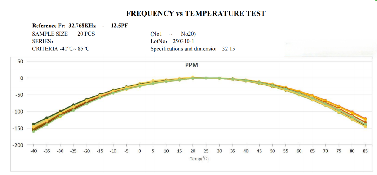频率温度特性:音叉晶振(如32.768kHz)的频率温度曲线为负二次方抛物线,以25℃为中心点,温度升高或降低均导致频率下降(减慢),例如偏离25℃时,频率偏差呈平方关系增长。
